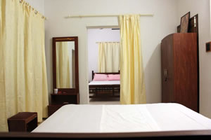 A rustic house very close to the beach with a living room, balcony and terrace. For most guests it is a dream come true. Both the bedroom suite and the double bed room on the two sides of a living room, are bath attached and tastfully furnished to retain the ethnic feel. Living room opens to the balcony on the west and the big blue sea.